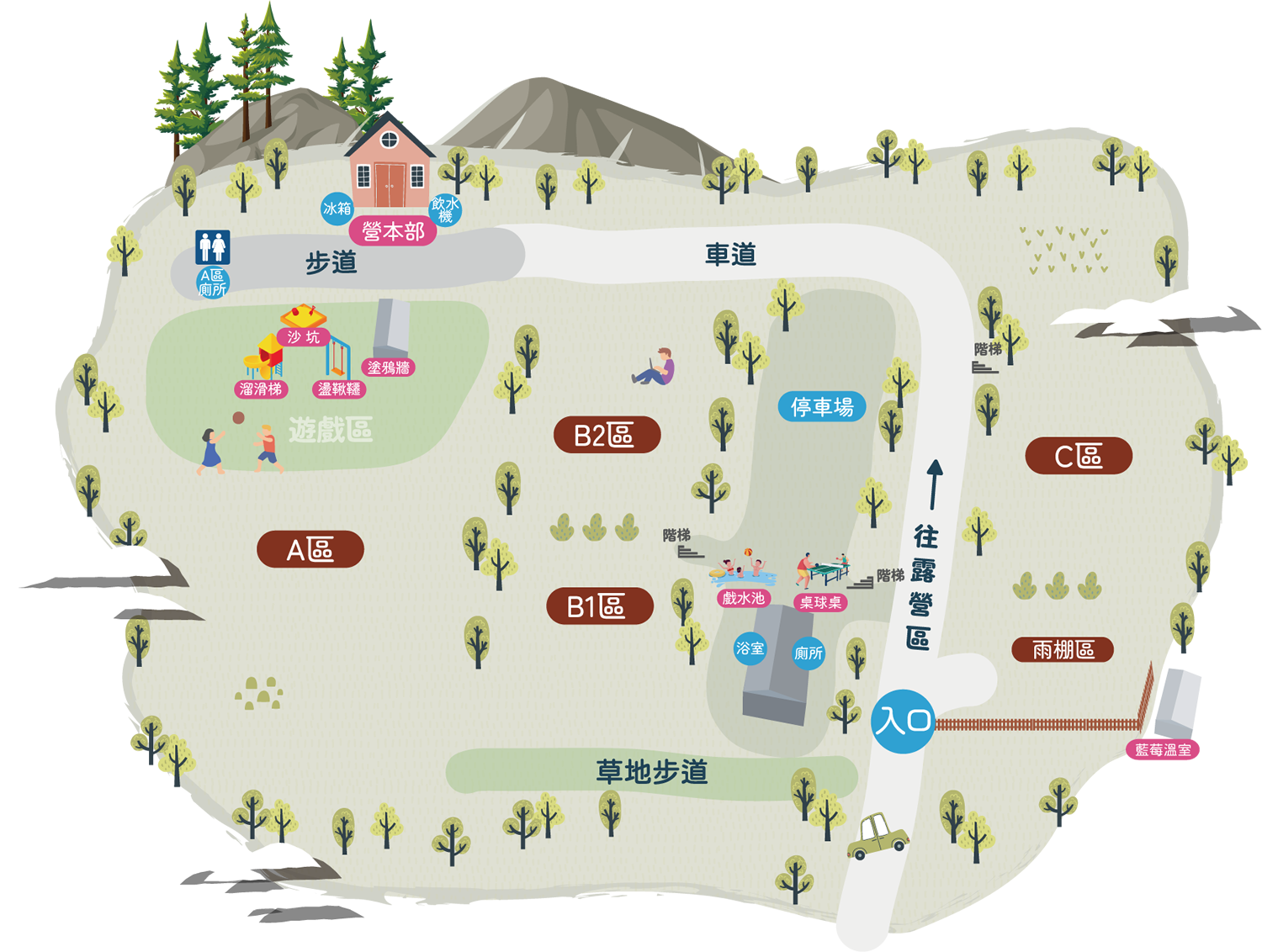 「我們規劃有適合熱鬧團露的大草地區,也有專屬的小包區;有輕鬆方便的車露區,到貼心規劃的雨棚區,多樣化的營位規劃,可滿足不同露友的需求。」